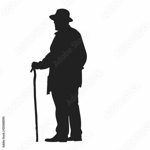 A man in a hat and a cane is standing on a sidewalk. He is wearing a jacket and pants