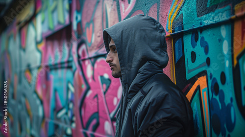 A man in a hood stands next to a wall covered in graffiti. His figure is immersed in shadow, which adds mystery and anonymity to him. The wall behind him is full of colorful, abstract patterns.