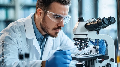 A man in a lab coat and safety goggles is using a microscope in a laboratory setting.