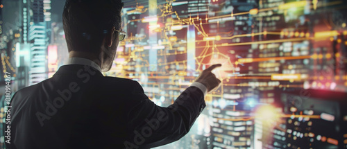 A man in a suit interacts with a futuristic digital interface, displaying a cityscape full of illuminated data points and networks.