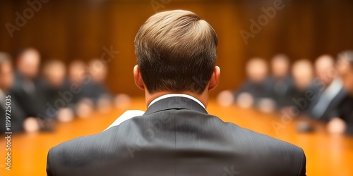 A man in a suit is seated at a long conference table, facing a group of indistinct individuals in a formal meeting setting. Concept Formal Business Meeting, Conference Table Dynamics