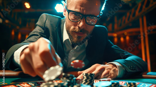 A man in a suit leans forward, intently watching the roulette wheel spin in a dimly lit casino setting
