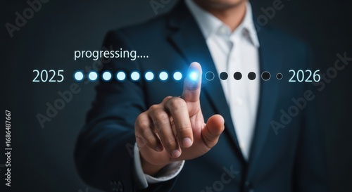 A man in a suit points to a progress bar indicating advancement towards the year 2026