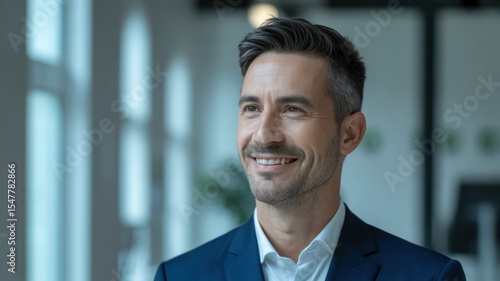 A man in a suit smiles while looking away, standing in a modern office environment.