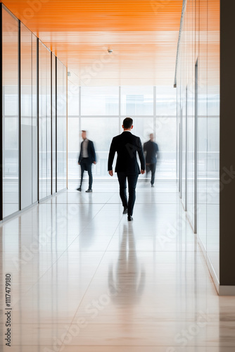 A man in a suit walks down a hallway with other people. The hallway is very long and has a lot of windows. The man is the only one in the foreground, and the others are in the background