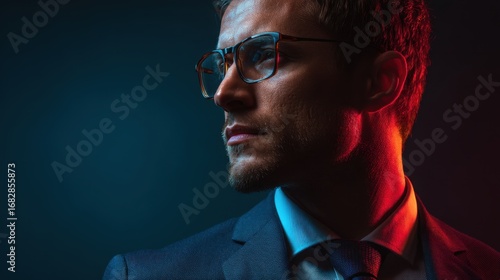 A man in a suit with glasses in dramatic lighting, representing success and future vision for business and management concept.