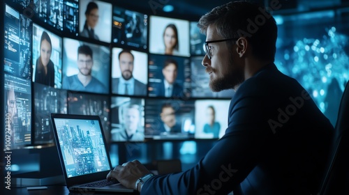A man in a suit works late at night on a laptop, surrounded by computer screens. The blue glow of the screens illuminates his face.