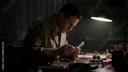A man in a trench coat examines an object under a desk lamp in a dimly lit room.