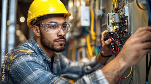 A man in a yellow helmet is working on a power box