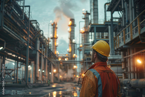 A man in a yellow helmet stands in front of a large industrial plant. The scene is dark and the man is looking up at something. Scene is serious and focused