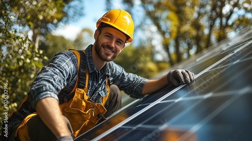 A man in a yellow vest is working on a solar panel. He is wearing a hard hat and gloves