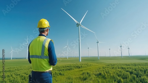 A man in a yellow vest stands in a field of wind turbines