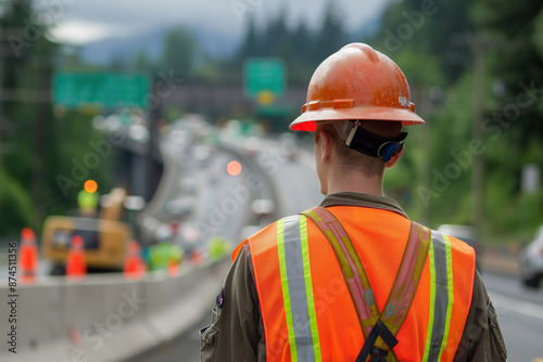 A man in a yellow vest stands on a road with orange and white barriers, generative ai image.