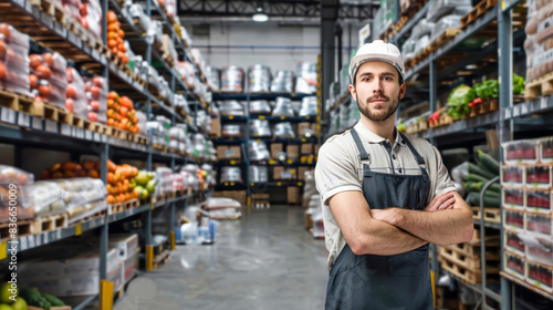 A man in an apron expertly navigates an aisle filled with vibrant fruits and vegetables