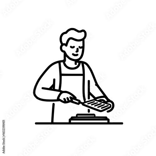 A man in an apron is cooking food on a griddle with a spatula in a black and white line drawing style