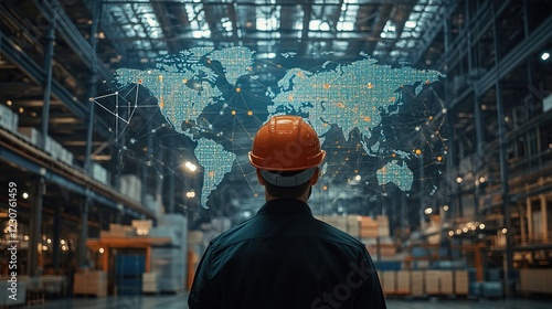 A man in an orange helmet stands inside the warehouse. Behind him is a world map with global and digital connections between villages.
