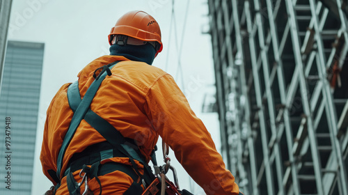A man in an orange safety suit is walking on a building. The man is wearing a hard hat and safety harness