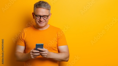 A man in an orange shirt is looking at his cell phone. He is smiling and he is enjoying himself