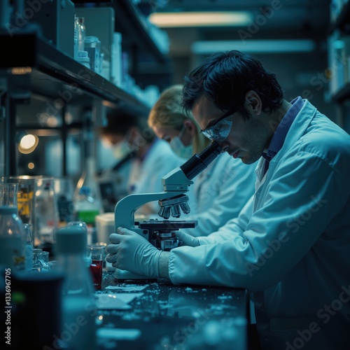 a man in lab coat is looking at a microscope