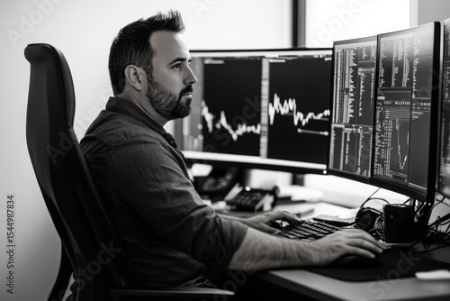 A man intently monitors multiple computer screens displaying financial data and code, deeply engrossed in his work.