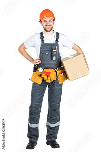 A man is a builder with a cardboard box in his hands. Isolated over white background.