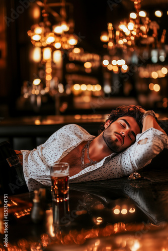 A man is laying on a bar counter with a glass of beer in front of him