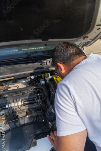 A man is looking at the engine of a car