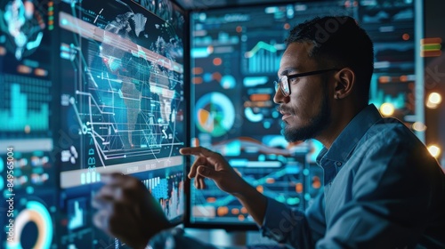 A man is pointing at a computer screen with multiple monitors displaying various graphs and data. Concept of focus and concentration as the man navigates through the information on the screens