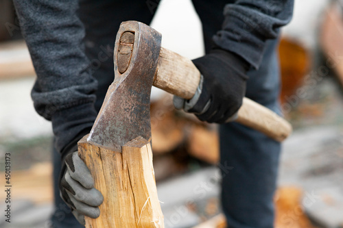 A man is sawing a tree with an ax. a strong man chopping logs with an ax. Firewood chopping process