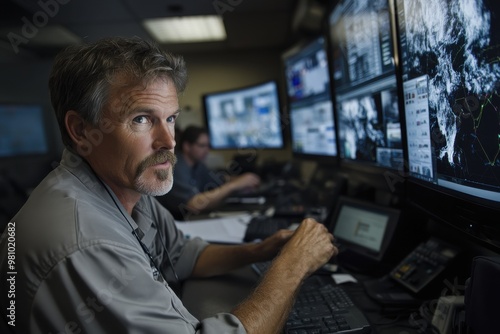 A man is seen attentively monitoring weather patterns and flood situations on several computer screens in a command center, epitomizing the importance of technology in disaster management.