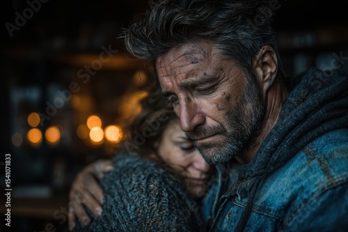 A man is seen comforting an anxious woman with a supportive hug in a dimly lit setting
