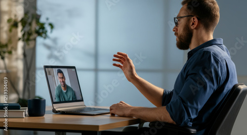 A man is sitting at a desk with a laptop and a cup of coffee