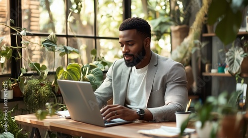 A man is sitting at a desk with a laptop. The scene suggests a professional work environment.