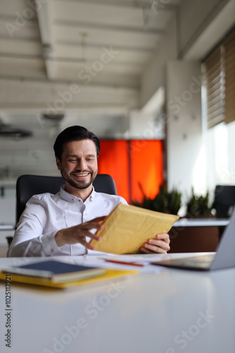 A man is sitting at a desk with a yellow envelope in his hand. He is smiling and he is happy