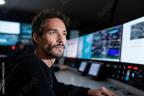 A man is sitting in front of a computer monitor with a serious expression on his face. He is looking at the screen, possibly working on a project or analyzing data. Concept of focus and concentration
