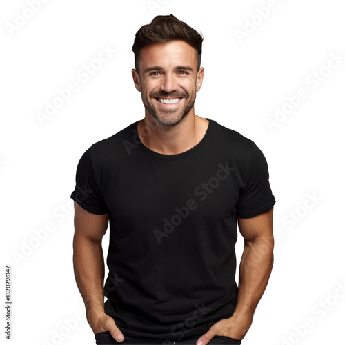 A man is smiling and wearing a black shirt isolated on transparent background