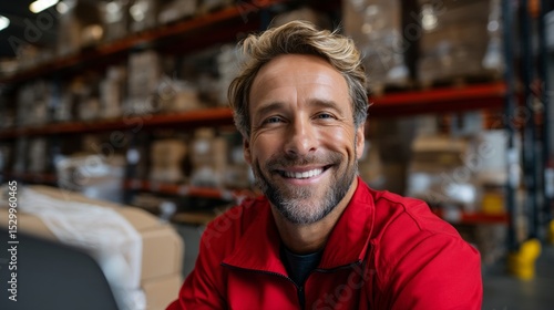 A man is standing in a warehouse setting, smiling at the camera, with boxes and packaging materials in the background.