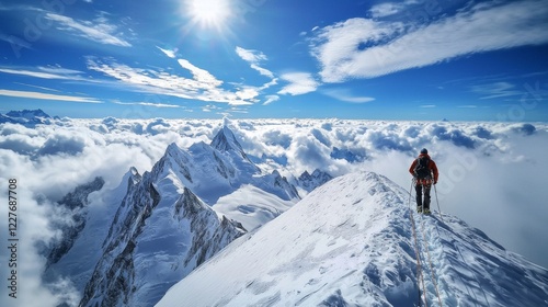 A man is standing on a snowy mountain peak