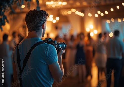 A man is taking a picture of a group of people at a party. The atmosphere is lively and fun, with people dancing and socializing. The man is capturing the moment