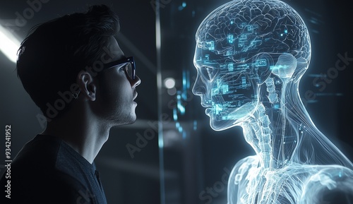 A man is talking to an AI robot, hologram-style. The background shows the human body with transparent skin and internal anatomy visible inside. advanced medical data analysis.