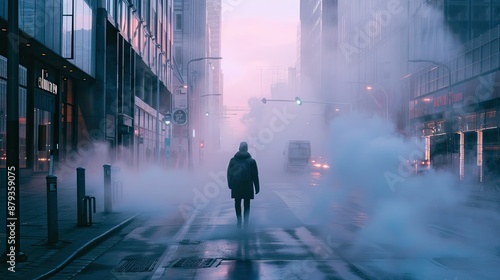 A man is walking on a city street in the fog