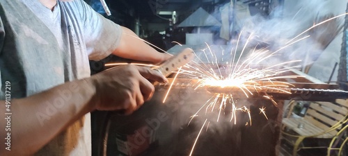 A man is welding steel in a factory. At night there was fire and smoke everywhere.