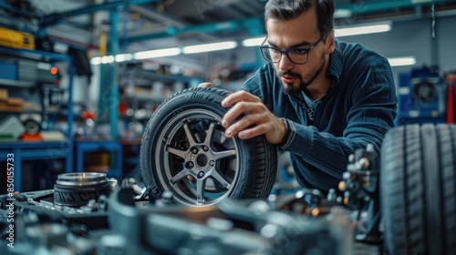 A man is working on a car tire in a garage
