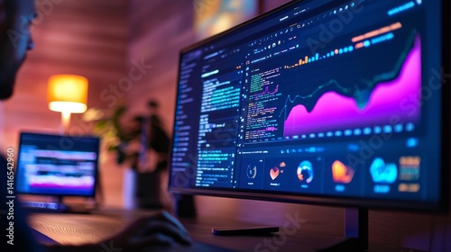 A man is working on a computer monitor with a lot of numbers and graphs on it