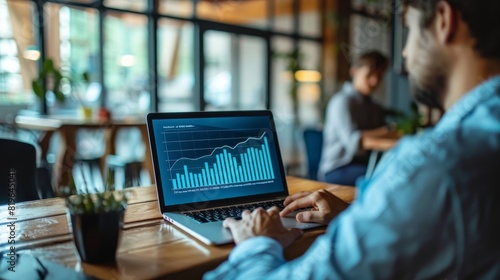 A man is working on a laptop in a cafe