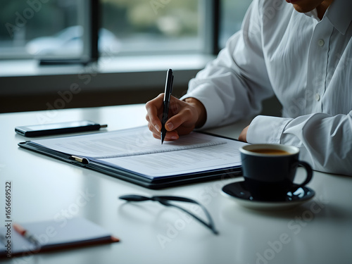 A man is writing in a notebook with a pen