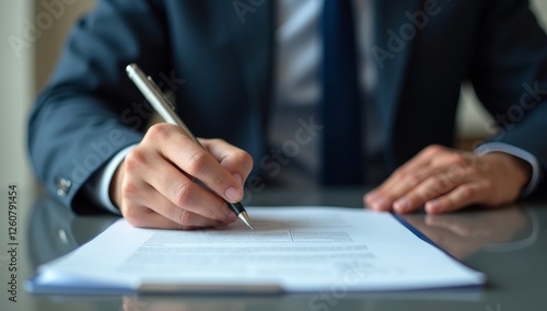 A man is writing with a pen on a piece of paper. Concept of professionalism and focus, as the man is likely writing an important document or note