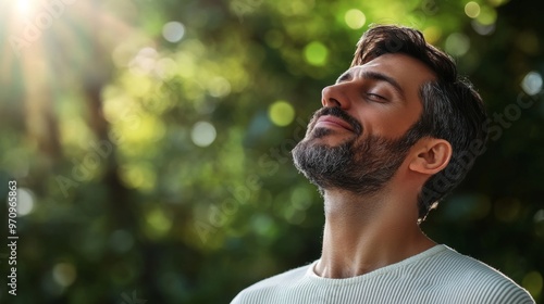 A man looking upwards, surrounded by a blurred natural background of trees and sunlight, indicating a sense of contemplation and connection with nature.