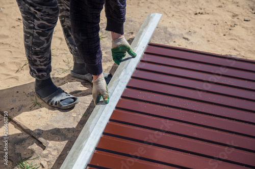 A man makes a fence of metal
