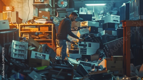 A man maneuvers through a cluttered, dimly lit room filled with electronic devices, portraying a tech repair workshop in motion.